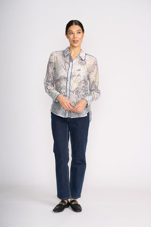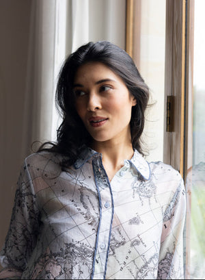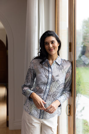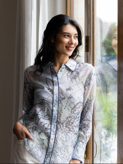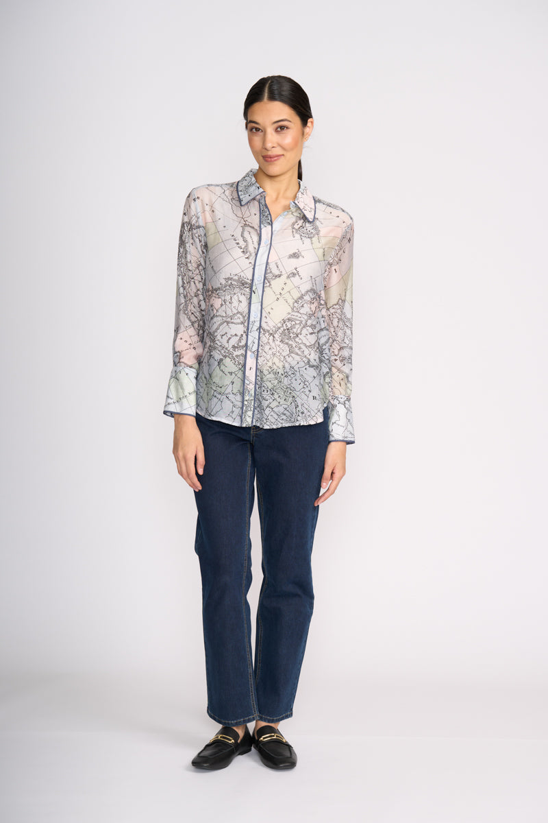 FOIL 's Autumn Winter range has so many winning prints! This season, the new Pipe Up Shirt comes in two awesome prints. This globe print is a fun statement shirt, in luxe fabrication and detail. A shirt you can rely on for dressing well for work and play.