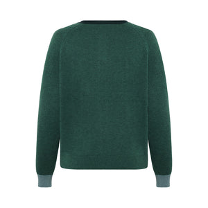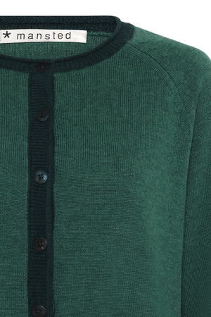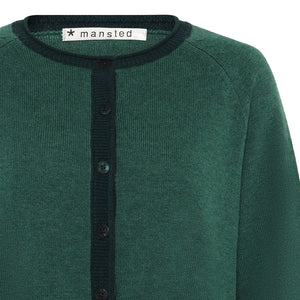 The Coral Cardi in Emerald is made from 70% merino wool, and 30% cotton. Cardigan with relaxed fit, short length and raglan sleeves. Colour block details, playful pockets in half cardigan knit and agoya shell button. A soft, durable and breathable knit, ideal for adding interest to everyday outfits.